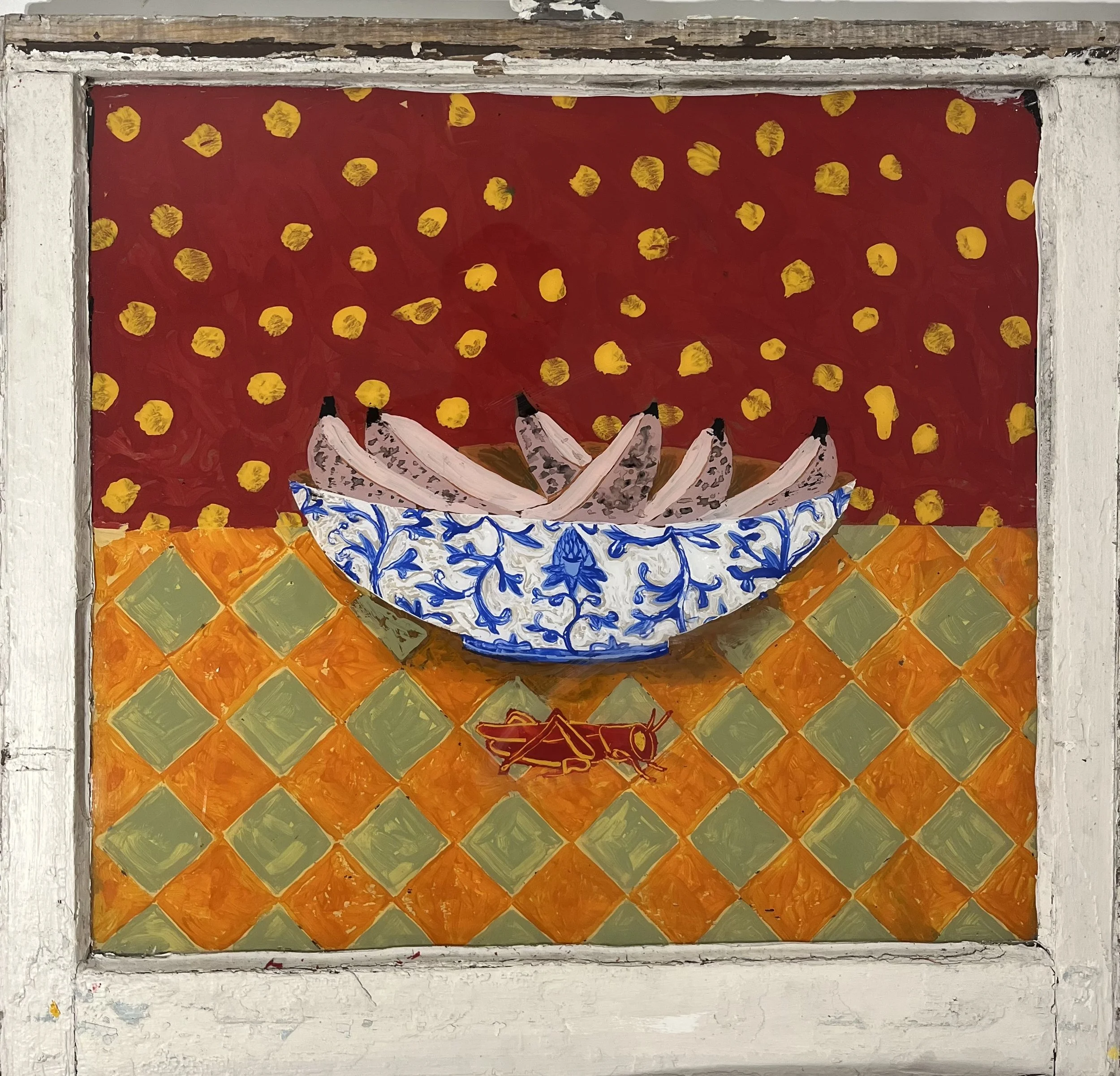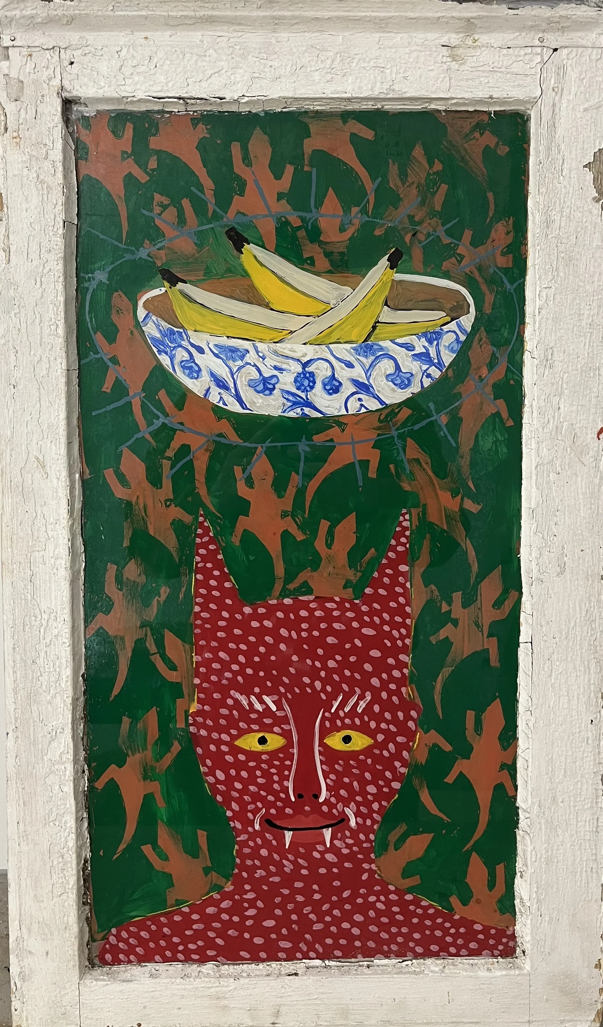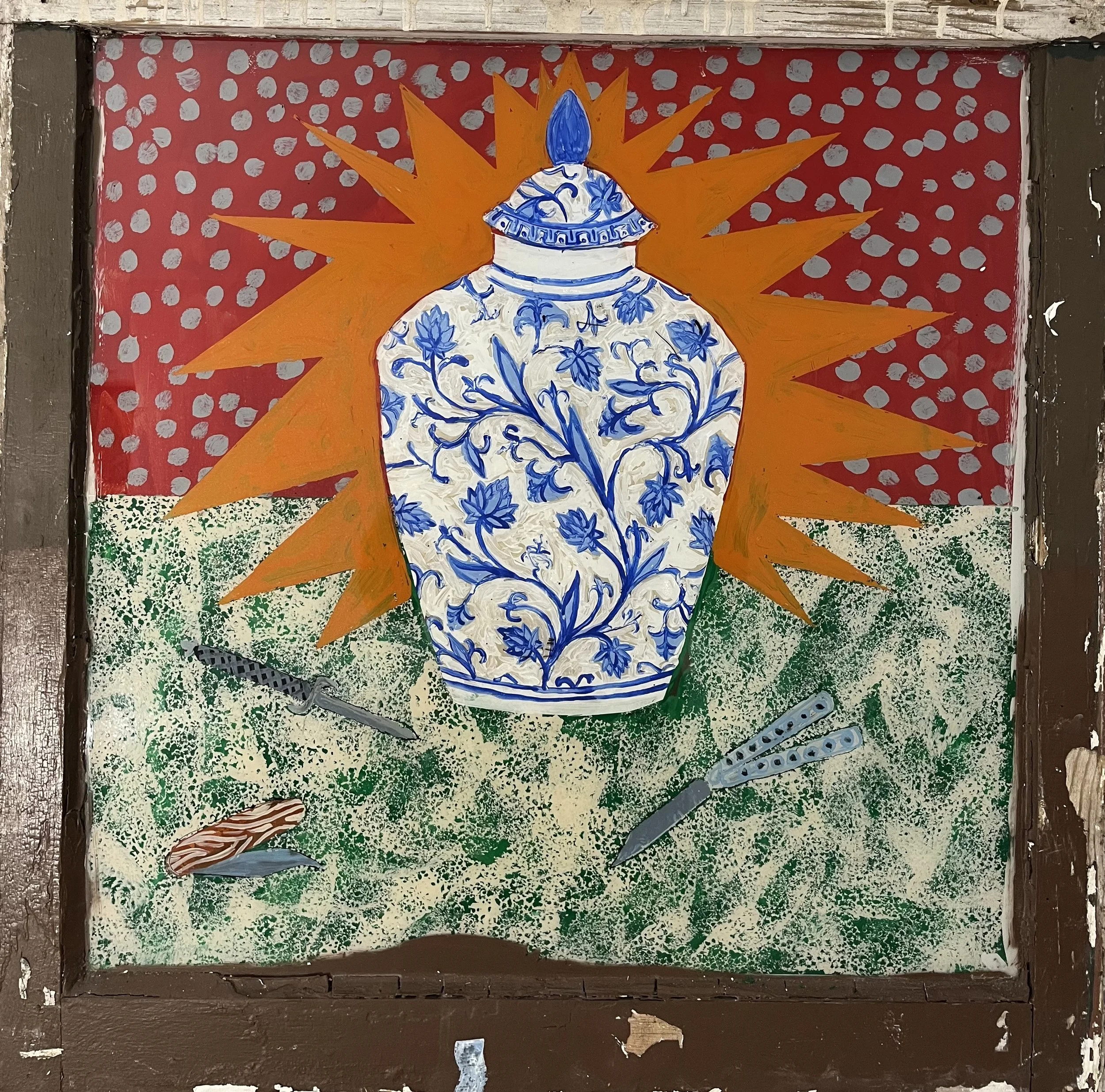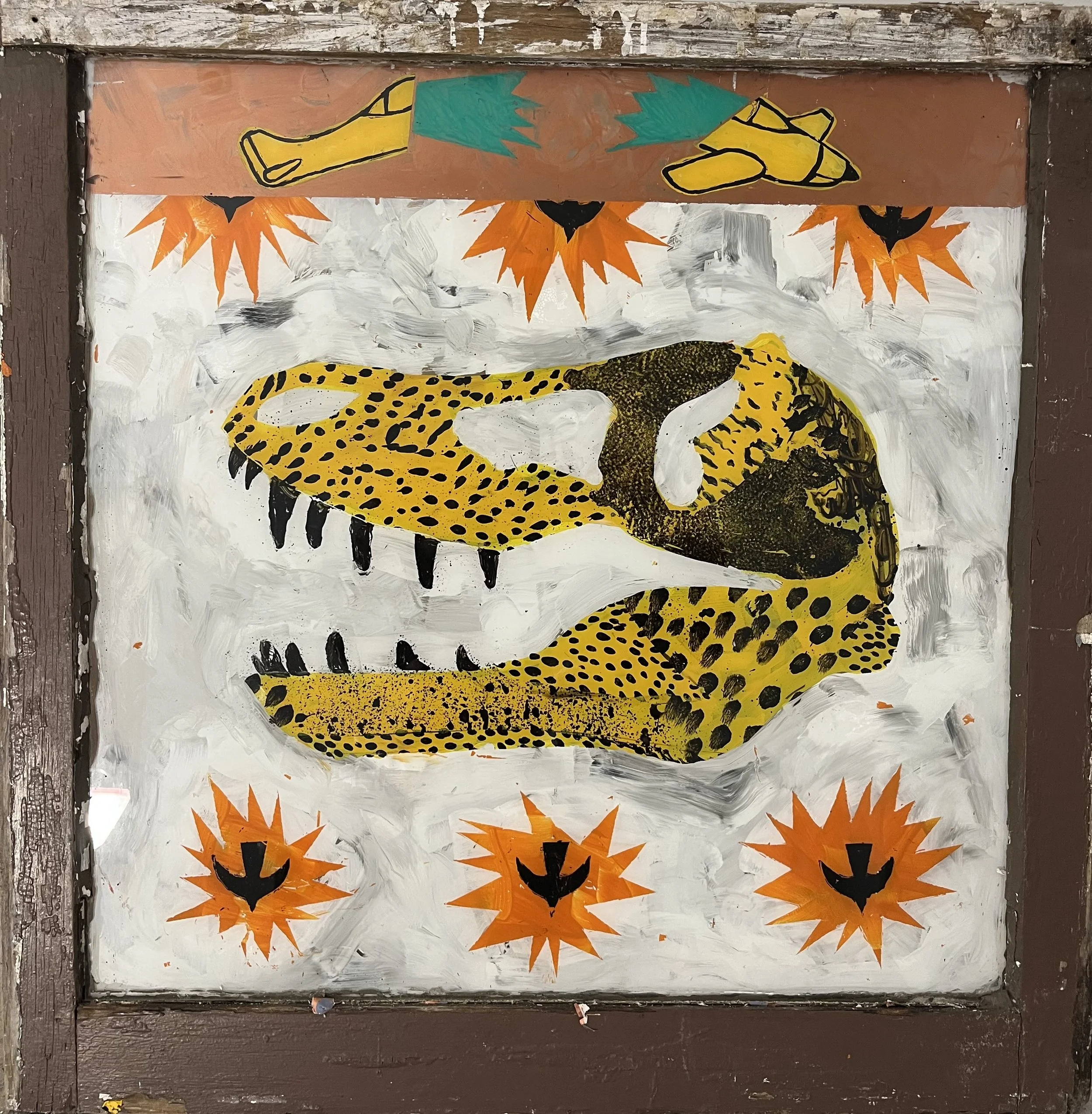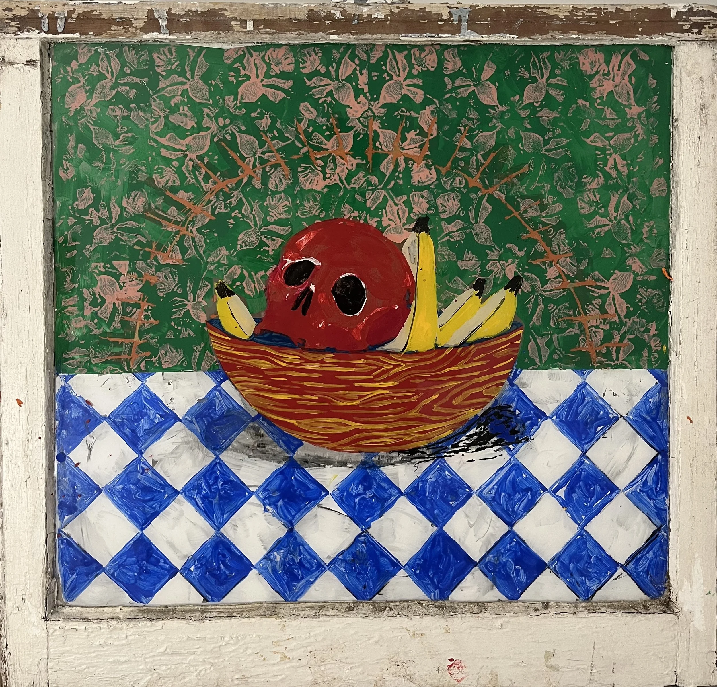 abstract still life.(potted plant, skull and jack-o-lantern)