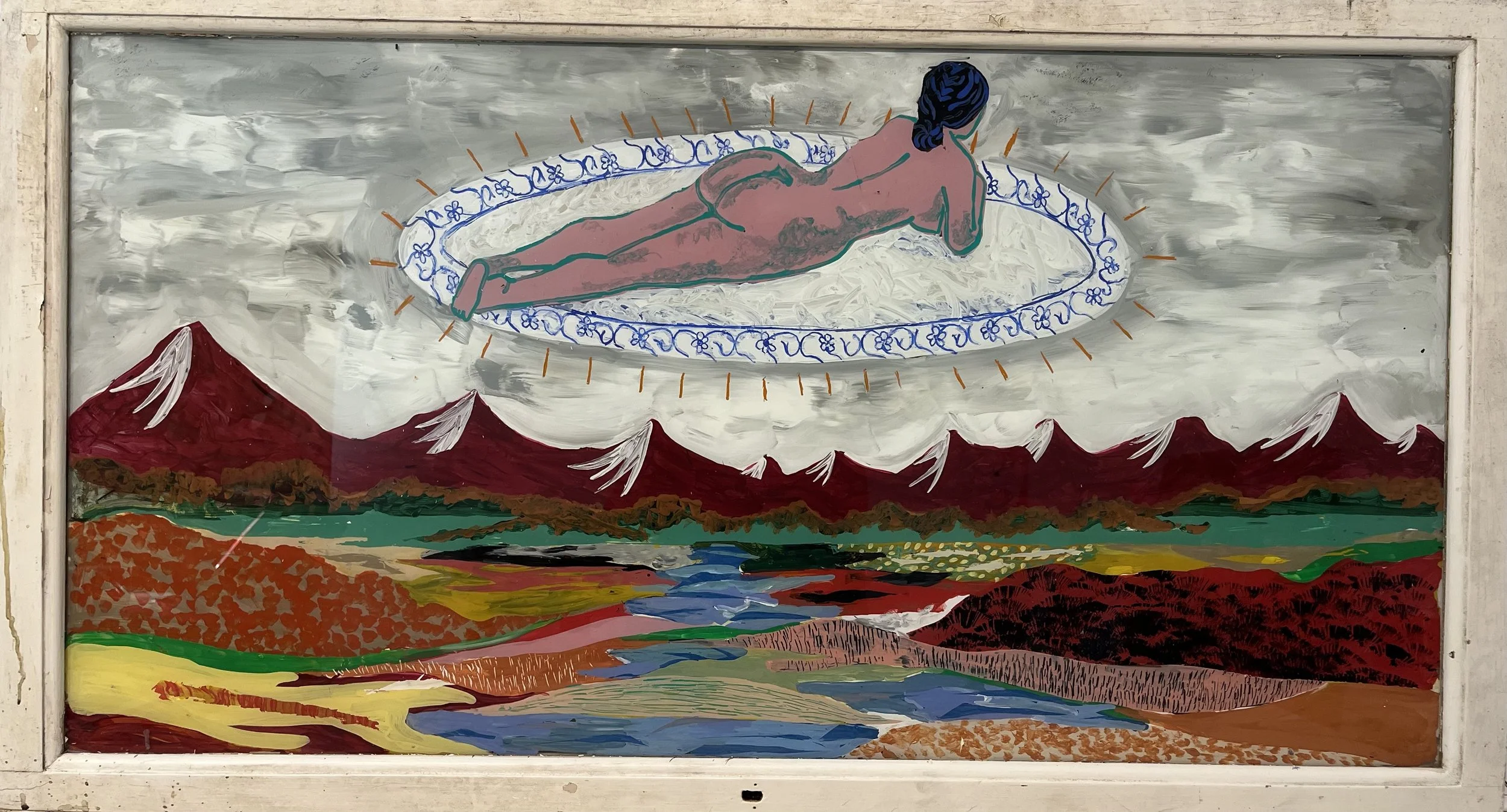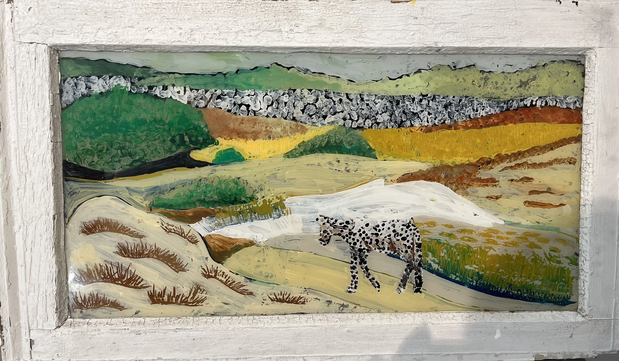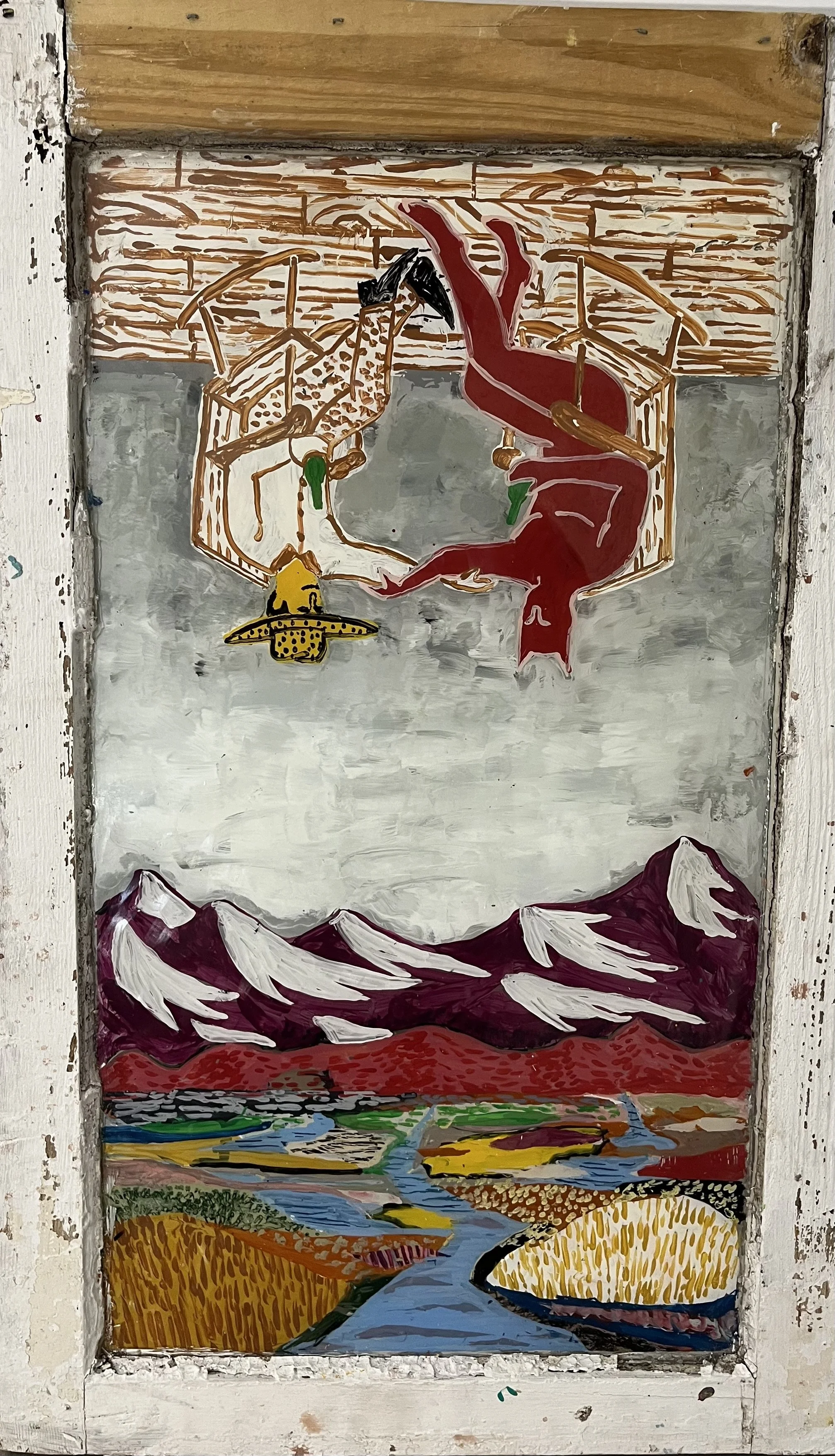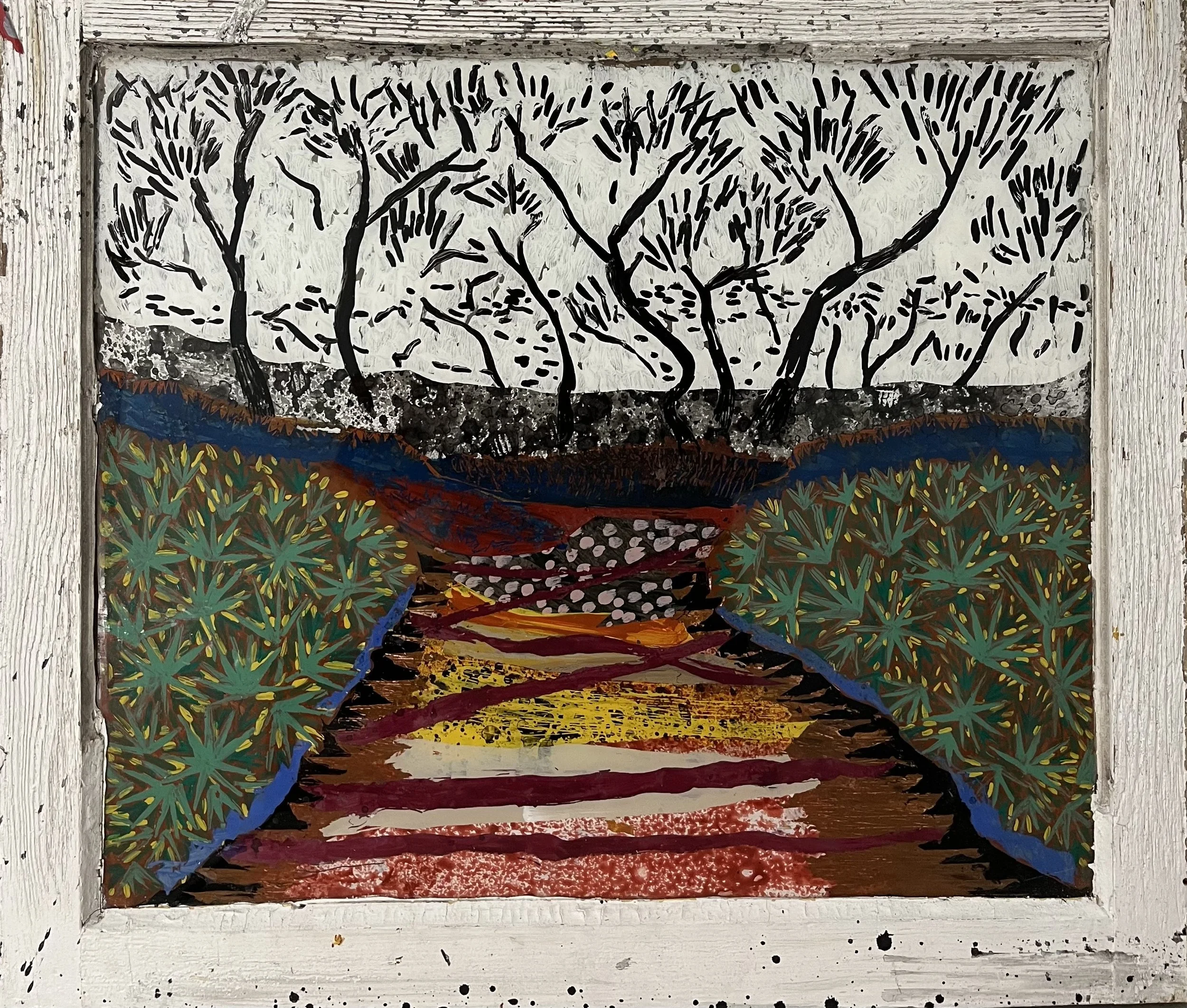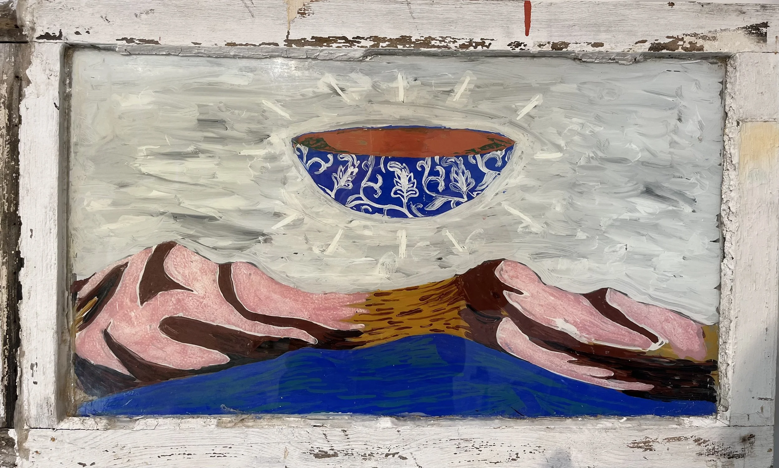 abstract still life.(potted plant, skull and jack-o-lantern)